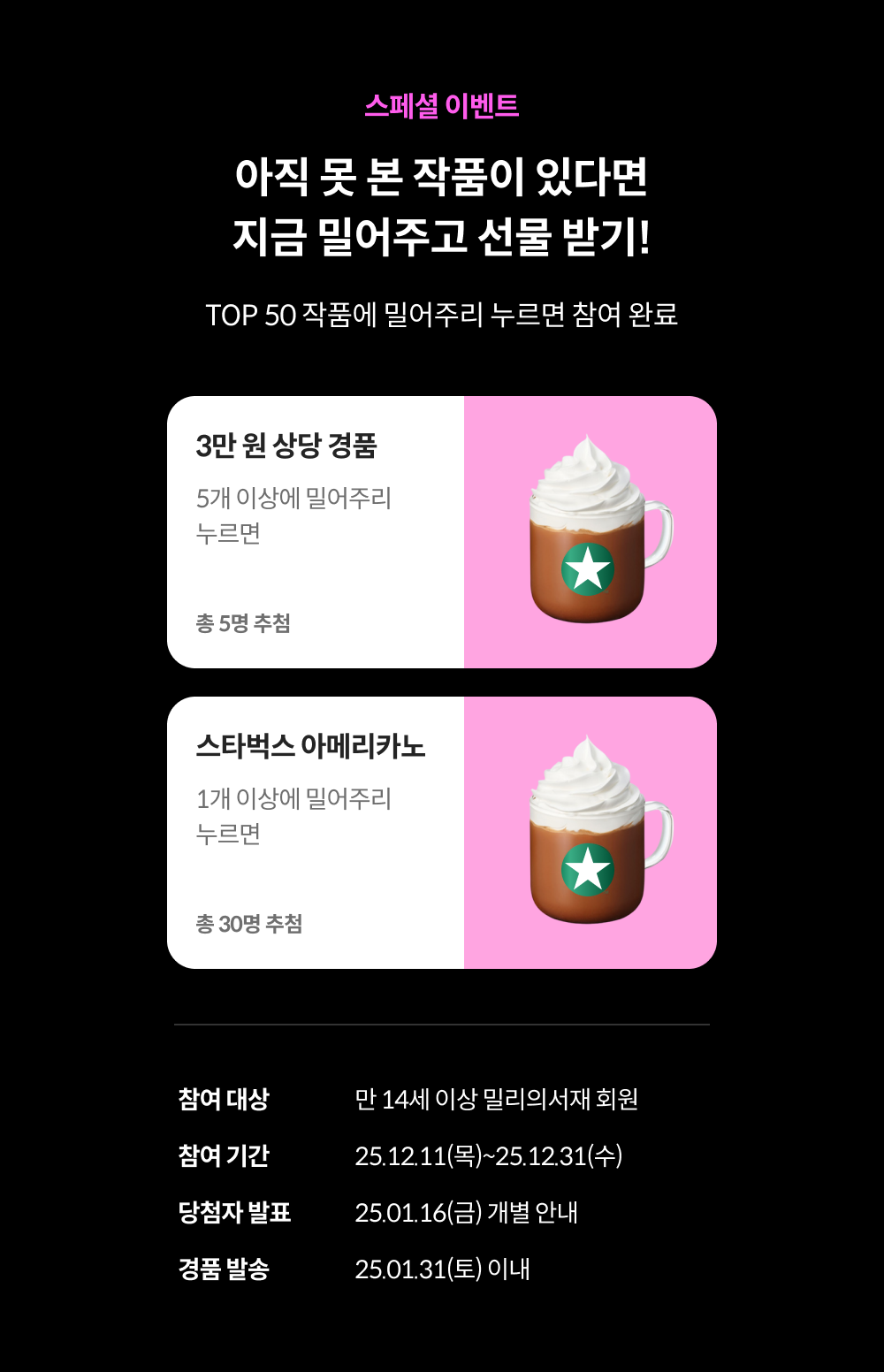 앞서 소개드린 작품 외에 아직 만나보지 못한 올해의 밀리로드 작품이 있으시다면, 밀리의서재가 준비한 스페셜 이벤트를 통해 확인해보세요!