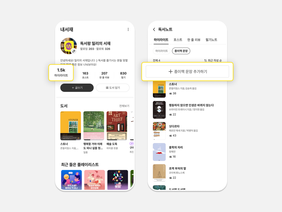 내서재 > 프로필 하단 하이라이트 > 종이책 문장 필터 > 종이책 문장 추가하기 클릭