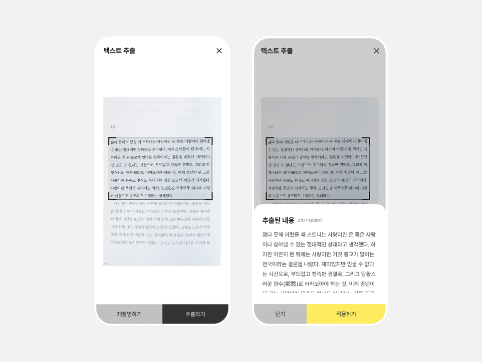 선택한 도서 페이지 > 가져올 문장 카메라로 스캔 > 추출된 내용 확인 > 적용하기