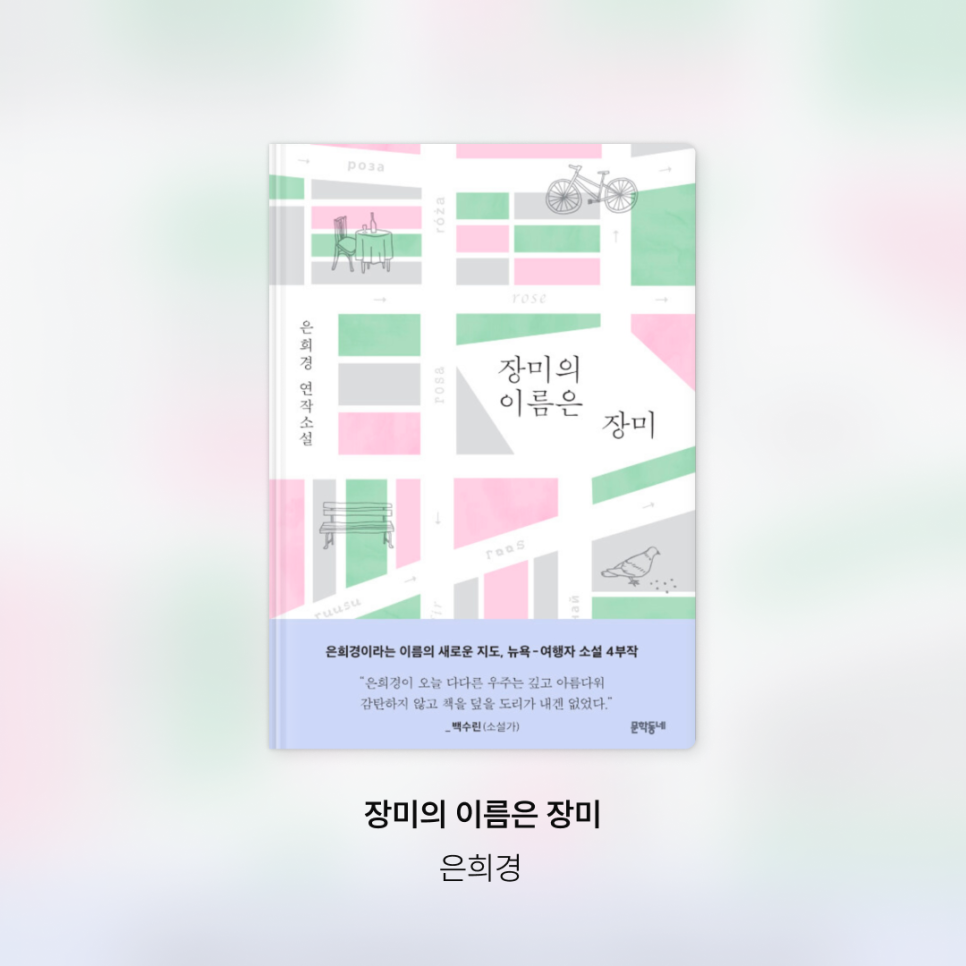 《새의 선물》을 인생 책으로 꼽는 분이라면, 은희경 작가의 또 다른 책 추천 작품인 《장미의 이름은 장미》도 추천드려요. 낯선 도시 뉴욕을 배경으로, 타인의 시선을 통해 나를 되돌아보는 네 편의 연작소설로 구성된 작품이에요.